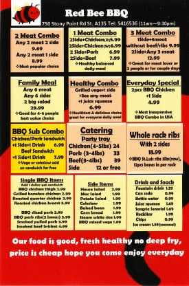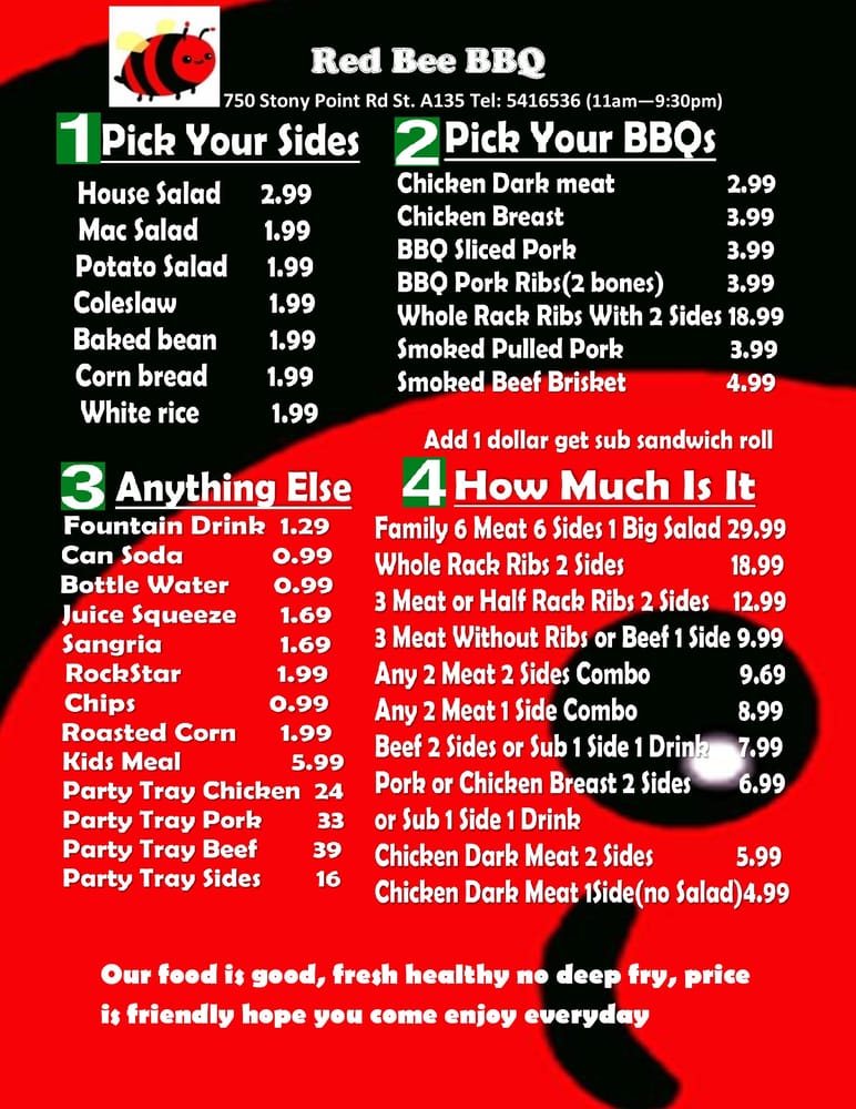 Welcome to Red Bee BBQ, where the aroma of smoky grilled meats meets fresh, vibrant salads. Nestled in Santa Rosa, California, this chicken shop elevates traditional barbecue with a diverse menu designed for all tastes. Whether you're in the mood for a whole rack of ribs served with two sides, or a refreshing Big House Salad with a variety of toppings, Red Bee BBQ caters to both casual diners and families.